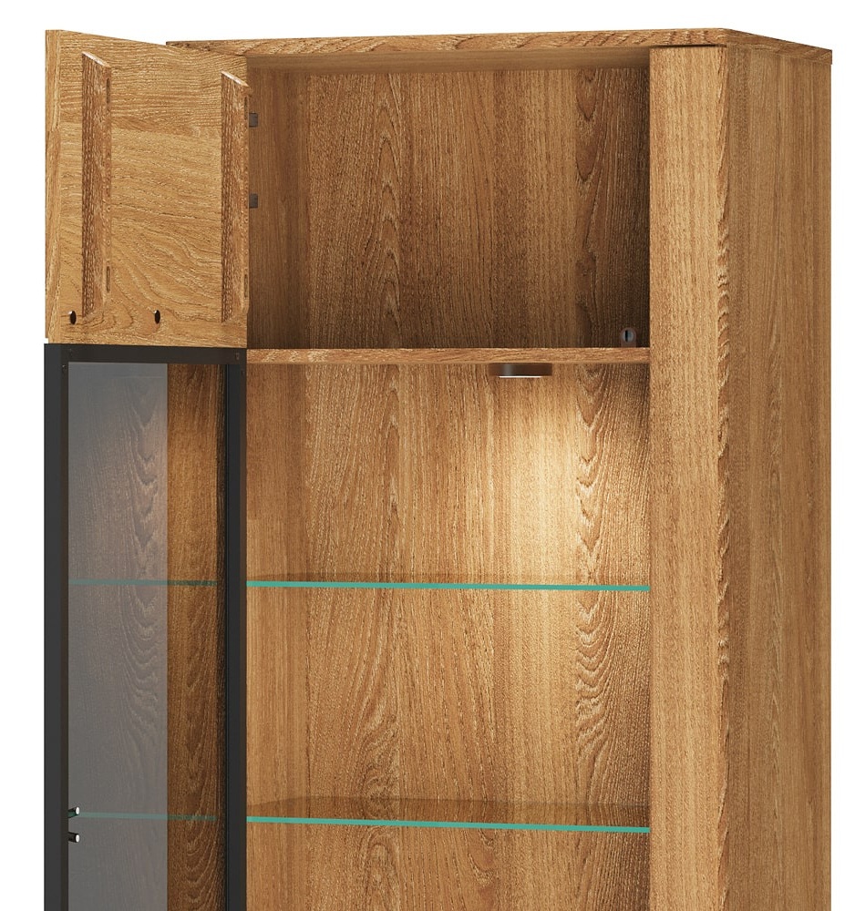 Vitriinkapil on 1 karastatud klaasiga uks. Ukse taga on 5 riiulit (2 mööbliplaadist ja 3 klaasist). Lisavalikuna võimalik juurde osta led valgustus klaasist riiulitele. Uks on vaikselt sulguv. Korpus: spoonitud plaat, õlitatud kuldse tamme värvi. Esipinnad: täispuidust, õlitatud kuldse tamme värvi. Käepidemed ja jalad: metallist, mattmusta värvi. Ümarad nurgad. Toode tarnitakse kokkupanduna. Toodetud: Poolas. Laius: 70 cm. Sügavus: 42 cm. Kõrgus: 200 cm. Kaal: 73 kg. Tarneaeg: 4-8 nädalat.