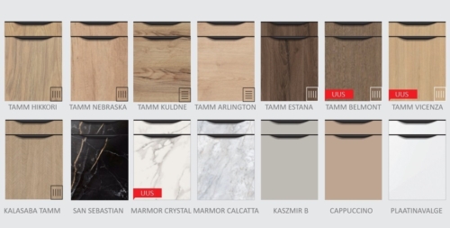 - Esipindade värvivalik: tamm hikkori; tamm nebraska; tamm kuldne; tamm arlington; tamm estana; tamm belmont; tamm vicenza; kalasaba tamm; san sebastian; marmor crystal; marmor calcatta; kaszmir B; cappuccino; plaatinavalge.
