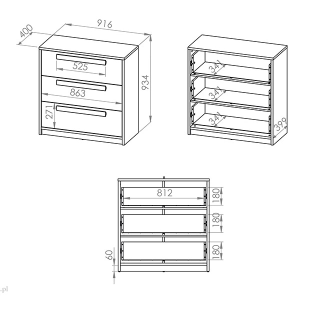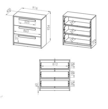 Kummutil on 3 sahtlit.