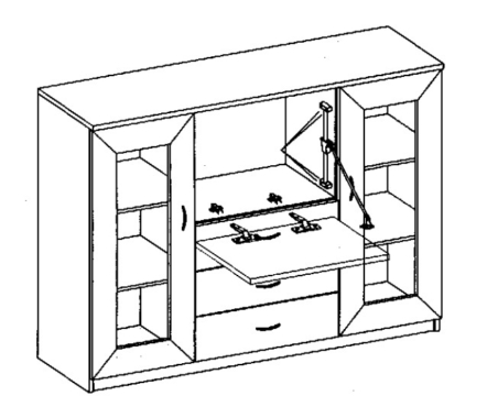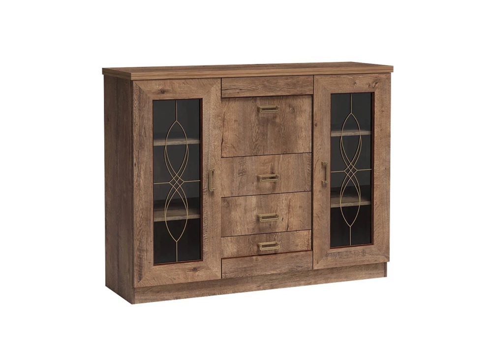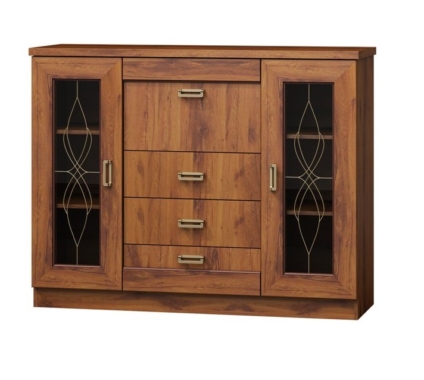 Kummutil on 2 klaasiga ust, 1 klapiga uks, mis avaneb ette ja 3 sahtlit.