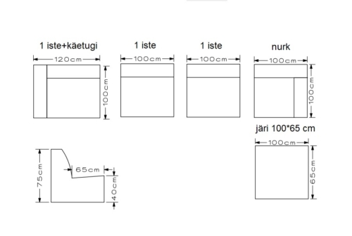 Komplekti kuulub: 1-ne moodul käetoega; 2 x 1-ne moodul; nurgamoodul ja järi 65 x 100 cm.