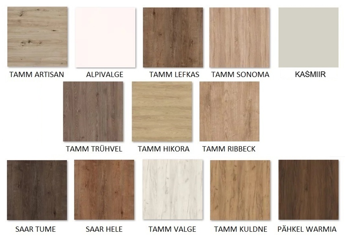 Värvivalik: tamm artisan; alpivalge; tamm lefkas; tamm sonoma; kašmiir; tamm trühvel; tamm hikora; tamm ribbeck; saar tume; saar hele; tamm valge; tamm kuldne; pähkel warmia.