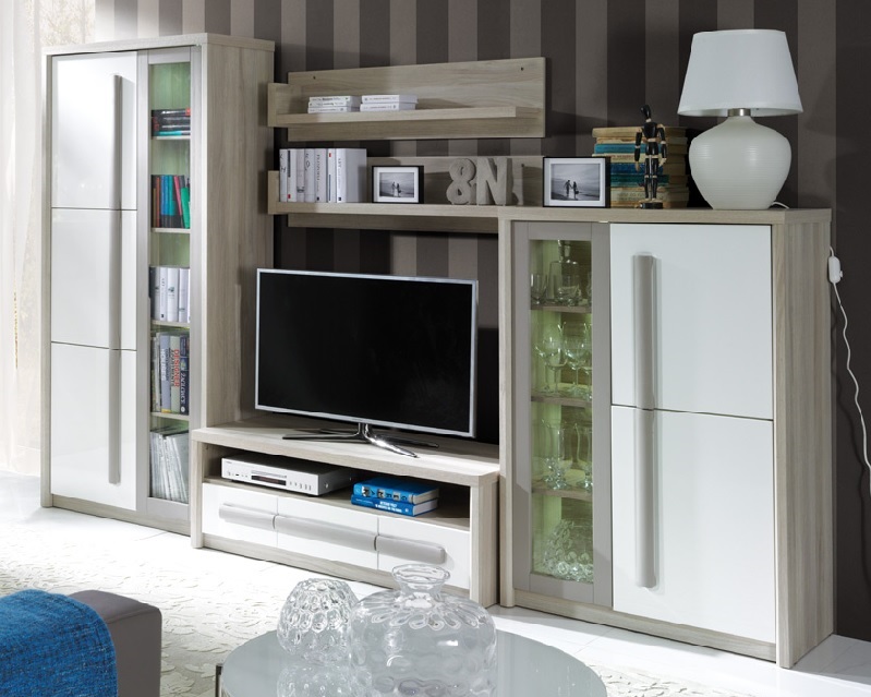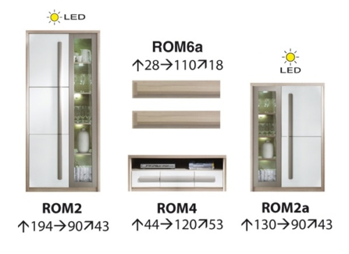 Komplekti kuulub: vitriinkapp ROM/2; tv-alus ROM/4; 2 seinariiulit ROM/6a ja vitiinkapp ROM/2a.