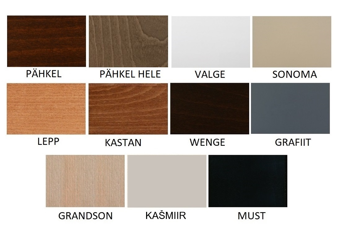 Puidu värvid: pähkel; pähkel hele; valge; sonoma; lepp; kastan; wenge; grafiit; grandson; kašmiir; must.