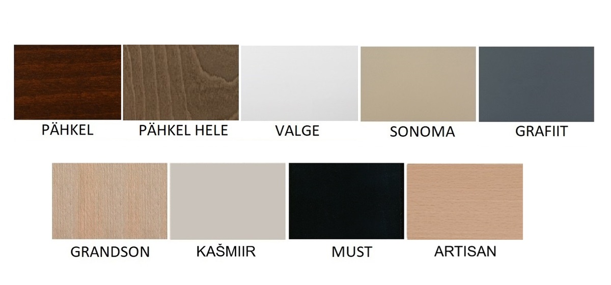 Puidu värvid: pähkel; pähkel hele; valge; sonoma; grafiit; grandson; kašmiir; must; artisan.