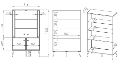 Esipinnad on valmistatud valget värvi läikivast MDF plaadist, paksusega 19 mm + karastatud klaas.