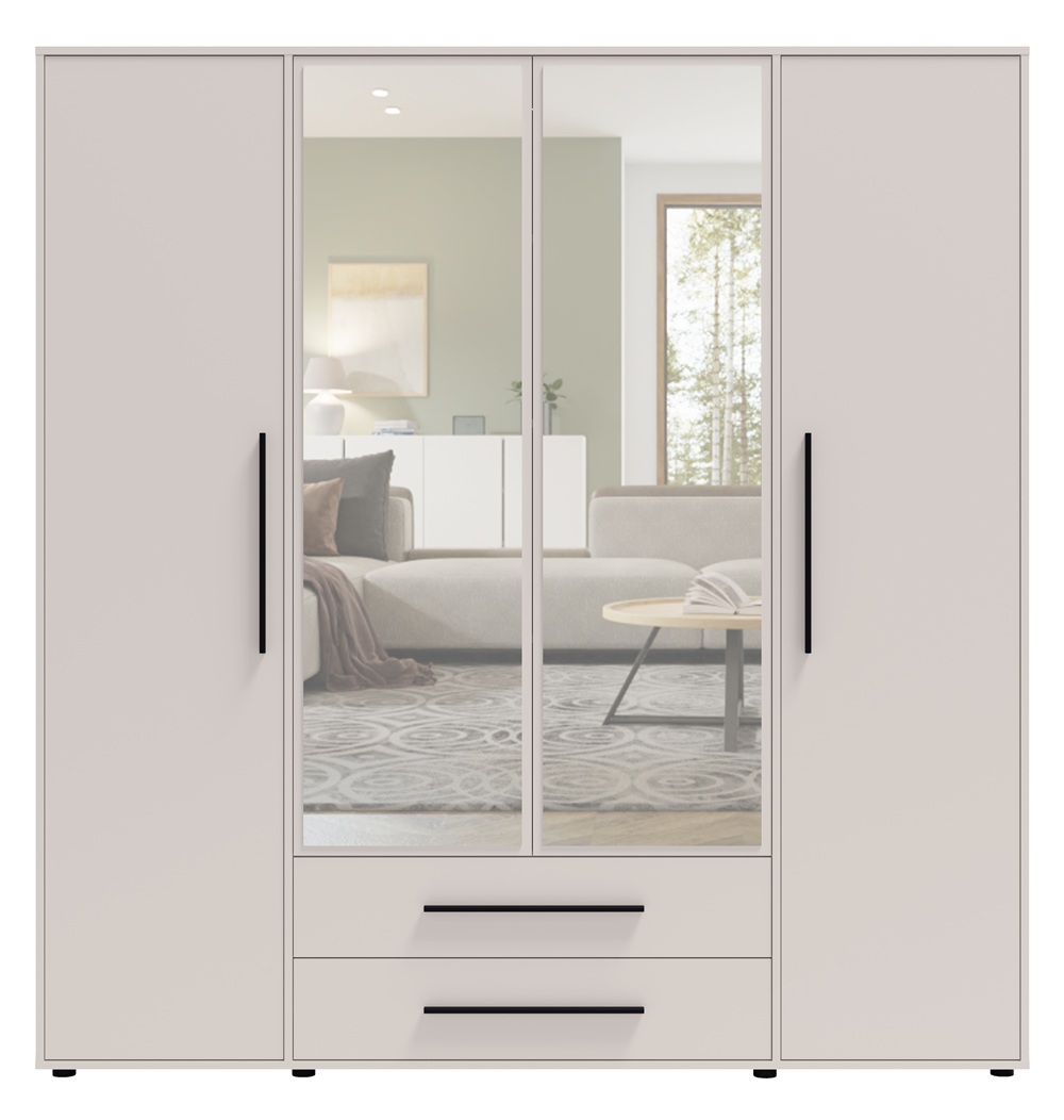 Riidekapil on 4 ust ja 2 sahtlit. Keskmised uksed on peegliga. Keskmiste uste taga on pesuriiulid, äärmiste uste taga on riidepuutoru. Lisavalikuna on võimalik juurde osta 4 uksega kõrgendus/ülakapp Maxione MX-06 (197,6 x 59 x 42,5 cm). Materjal: puitlaastplaat 16 mm. Servad: ABS. Värvivalik: kašmiir; valge; must; tamm artisan. Käepidemed: plastikust. Jalad: plastik 2,5 cm. Toode tarnitakse detailidena. Toodetud: Poolas. Laius: 197,6 cm. Sügavus: 59 cm. Kõrgus: 205,7 cm. Tarneaeg: 4-8 nädalat.