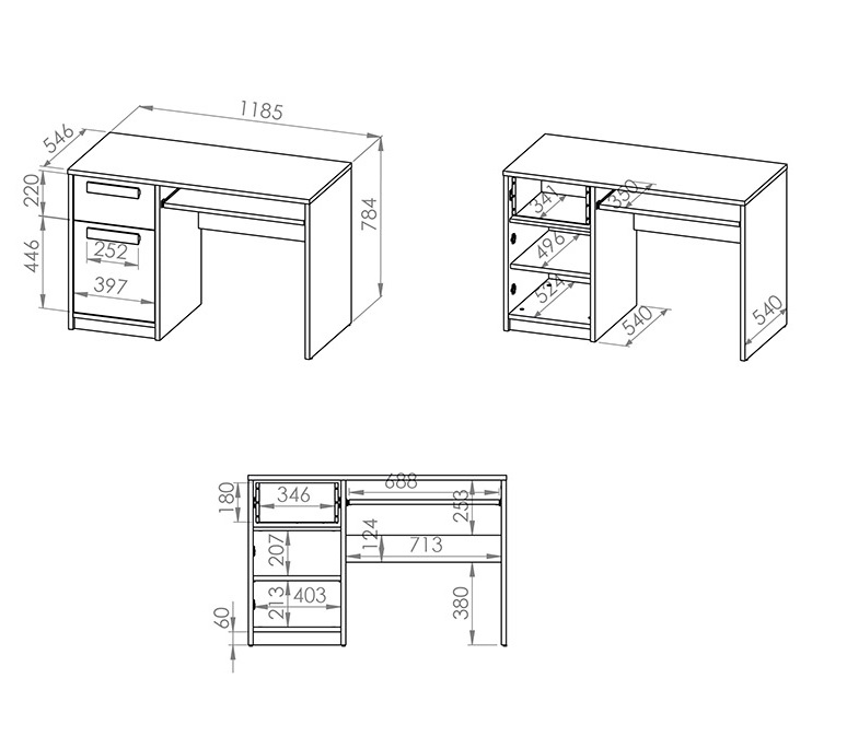 Arvutilaual on 1 sahtel, 1 uks ja väljatõmmatav klaviatuurialus.