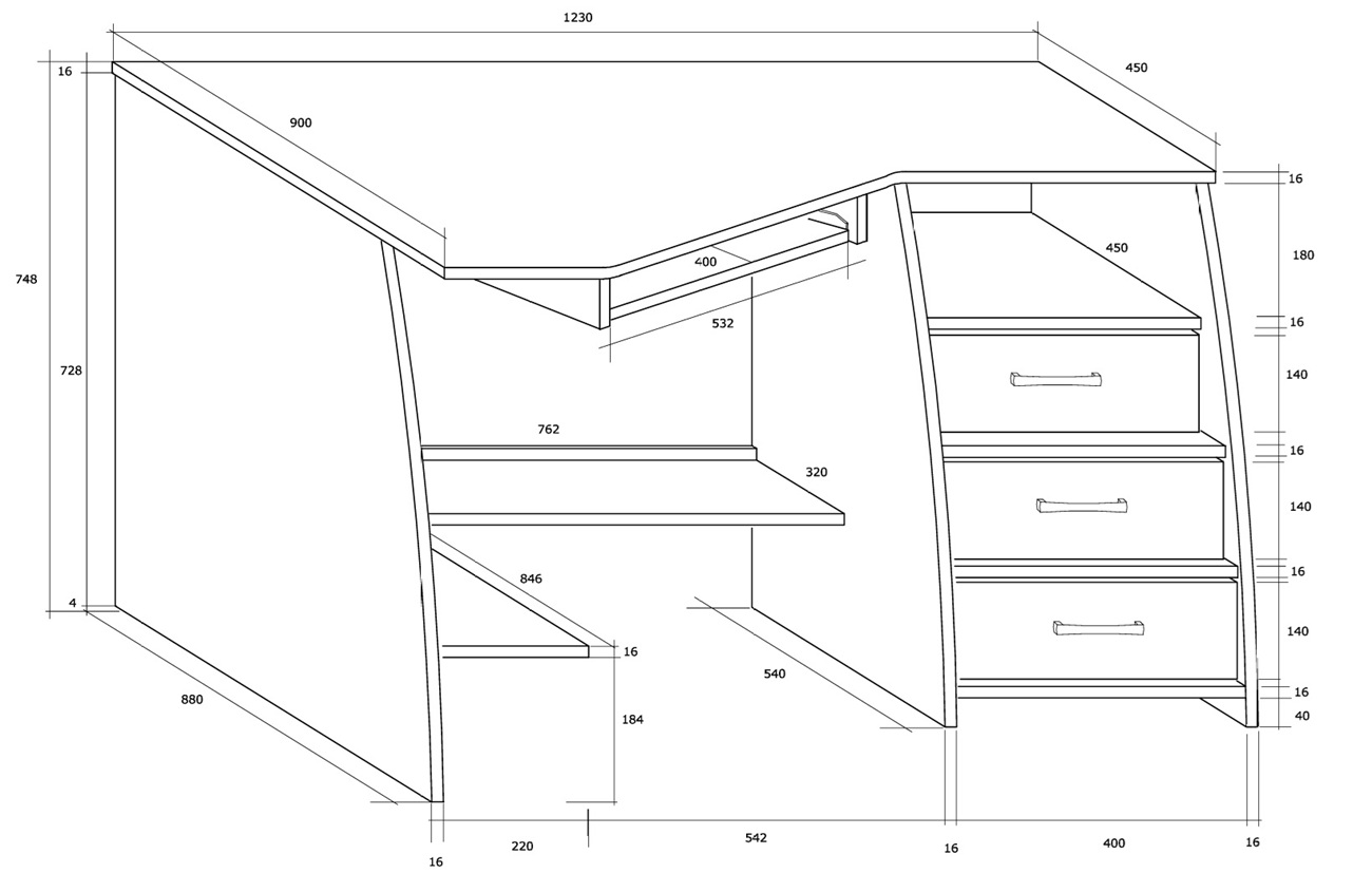 Arvutilaual on väljatõmmatav klaviatuurialus ja 3 sahtlit.