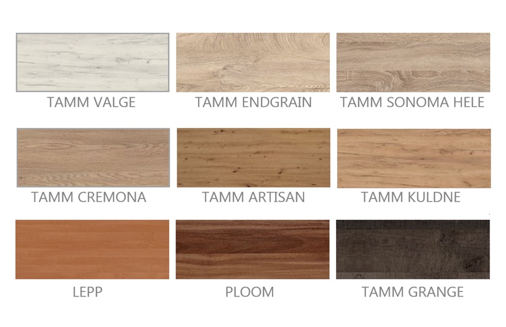 Värvivalik: tamm valge; tamm endgrain; tamm sonoma hele; tamm cremona; tamm artisan; tamm kuldne; lepp; ploom; tamm grange.