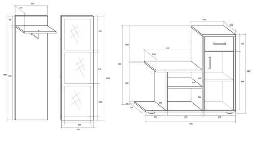 Komplekti kuulub: peegel, riidenagi ja jalanõudekapp.
