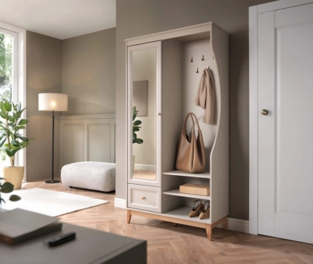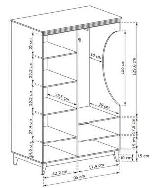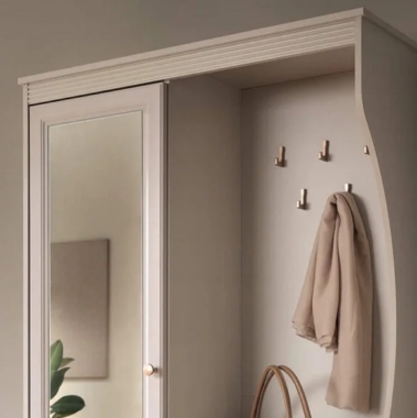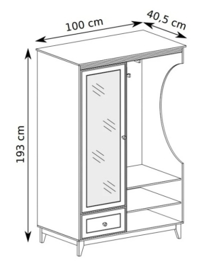 Esikukomplektil on 1 peegliga uks, mille taga on riiulid, 1 sahtel, avatud riiulid ja nagikonksud.