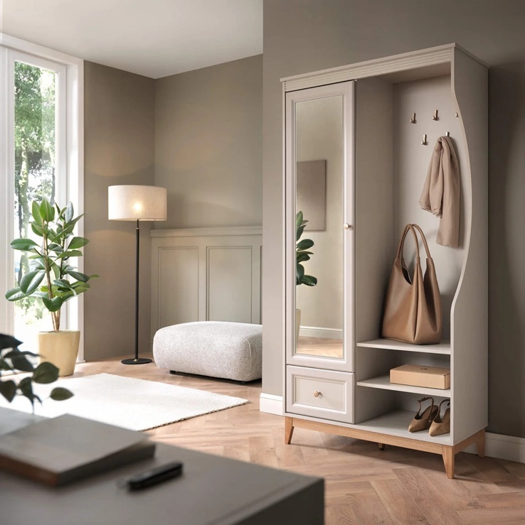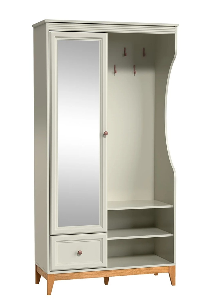 Esikukomplektil on 1 peegliga uks, mille taga on riiulid, 1 sahtel, avatud riiulid ja nagikonksud.