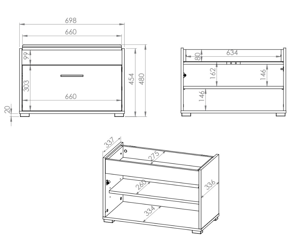1-ukse- ja panipaigaga jalanõudekapp. Uks avaneb ette.