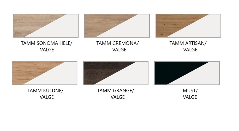 Värvivalik: tamm sonoma hele/valge; tamm cremona/valge; tamm artisan/valge; tamm kuldne/valge; tamm grange/valge; must/valge.