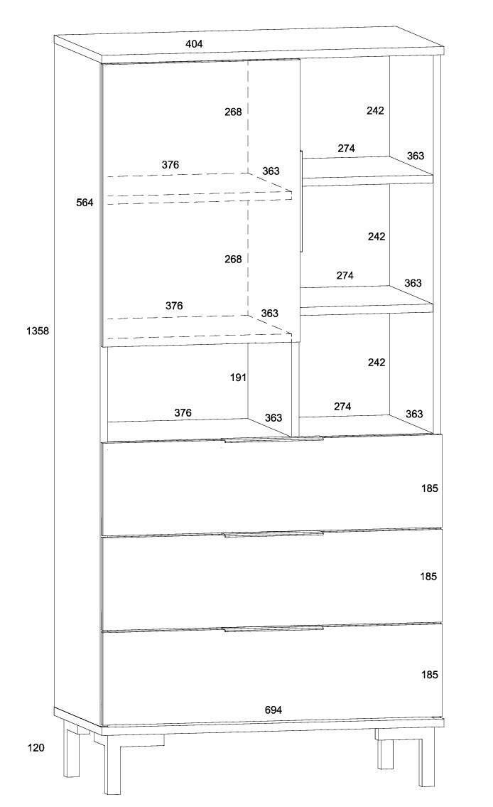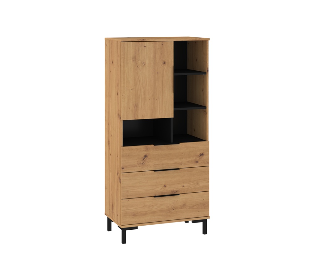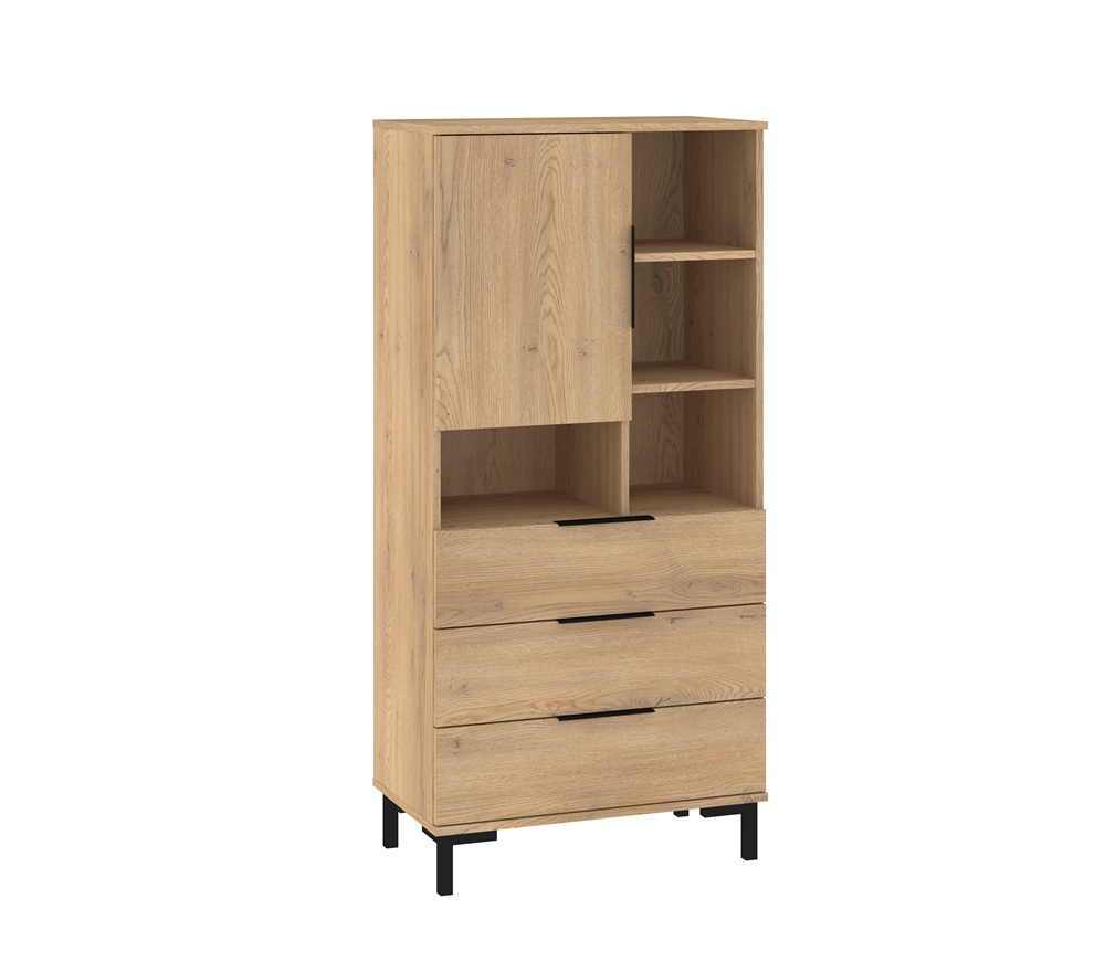 Kapil on 1 uks, 3 sahtlit ja avatud riiuliosa. Ukse taga on riiulid.