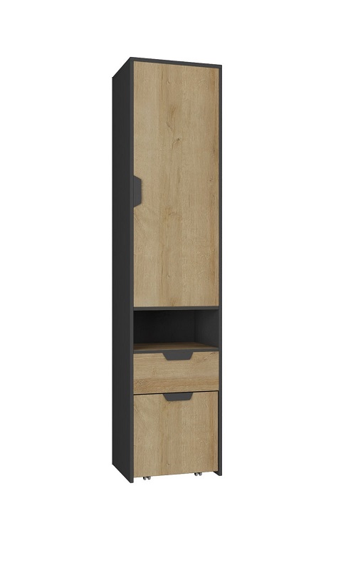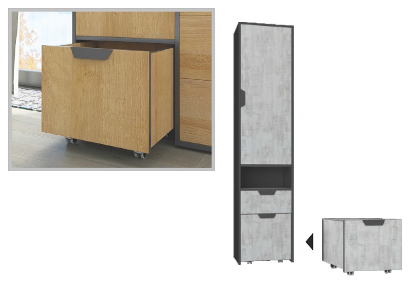 Riiulitega kapil on 1 uks, 1 sahtel ja 1 ratastel konteiner.