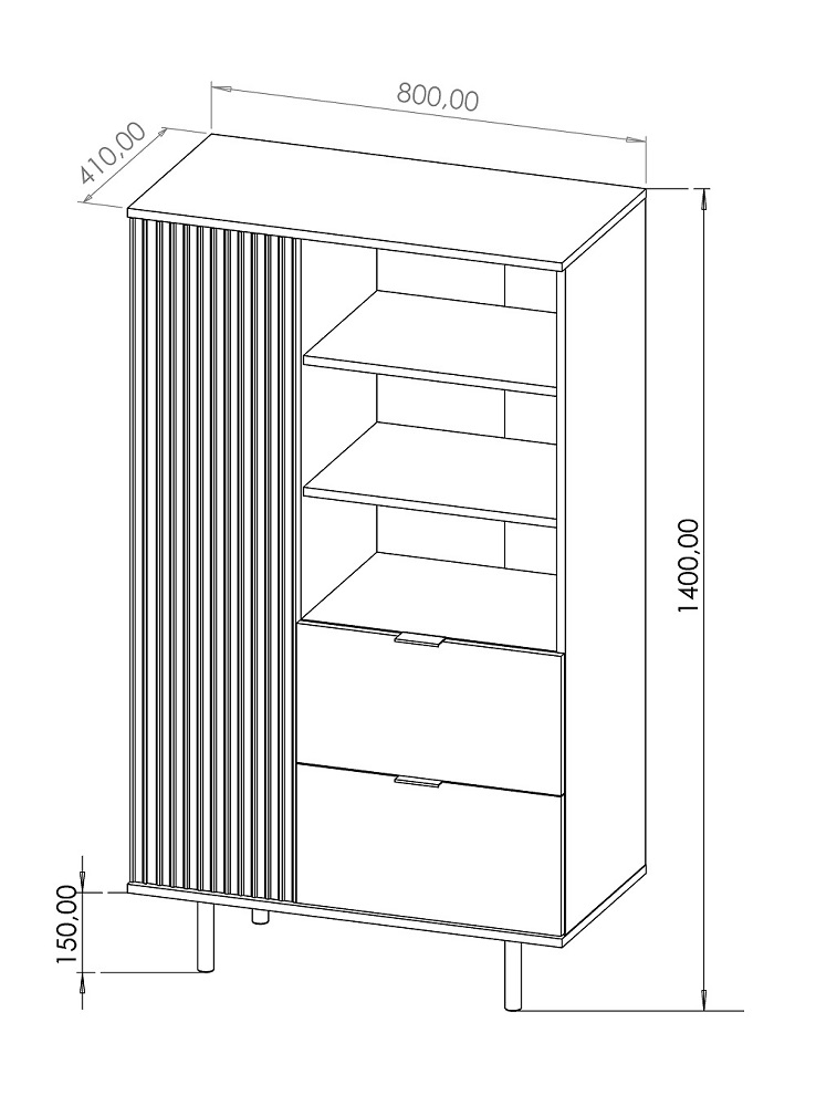 Laineline esipind: freesitud MDF plaat, kaetud fooliumiga – ilma käepidemeta/avaneb peale vajutades.