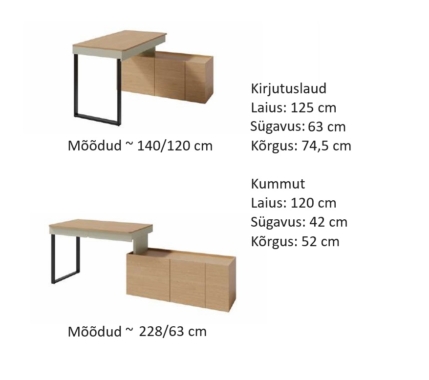 Kirjutuslaual on 2 sahtlit, kummutil on 3 ust.