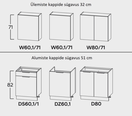 Ülemistel kappidel ei ole käepidemeid, kapi põhi on tagasi lõigatud.