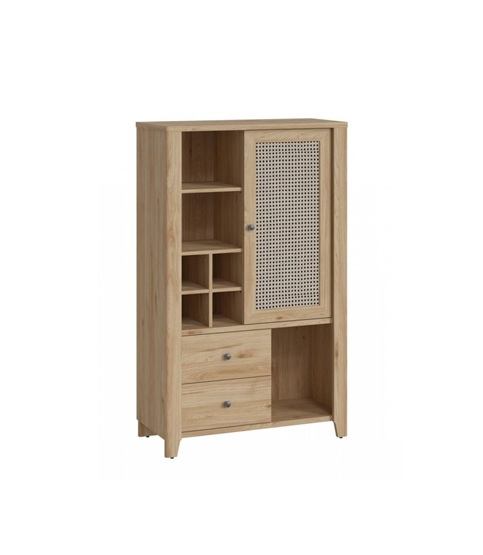 Kõrgel kummutil on 1 uks, 2 sahtlit ja avatud riiulid.