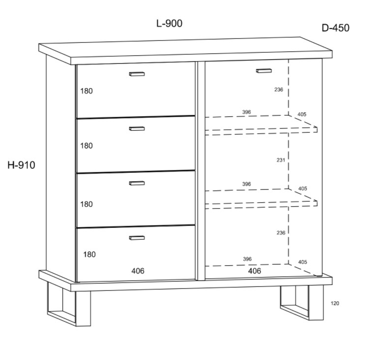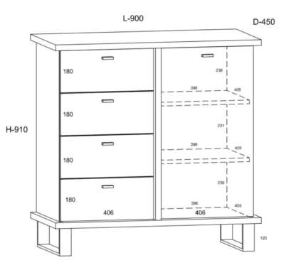 Kummutil on 1 uks ja 4 sahtlit.