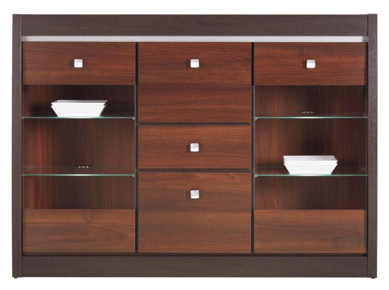 Kummutil on 2 osaliselt klaasiga ust, 2 väikest ust ja 1 sahtel.