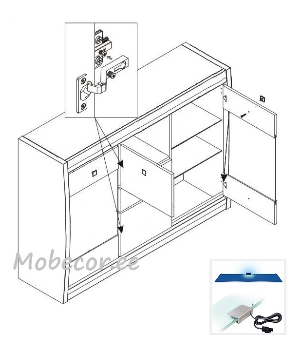Klaasiga uste taga on klaasriiulid, millele on võimalik juurde osta LED-valgustus.