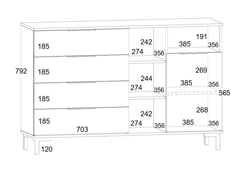 Kummutil on 4 sahtlit, 1 uks ja avatud riiuliosa.