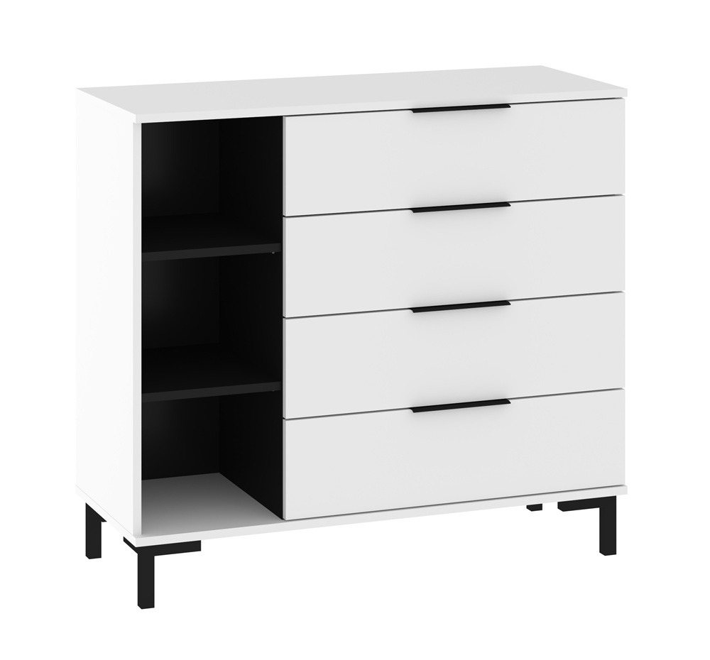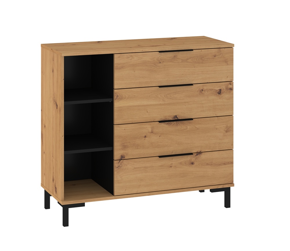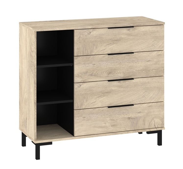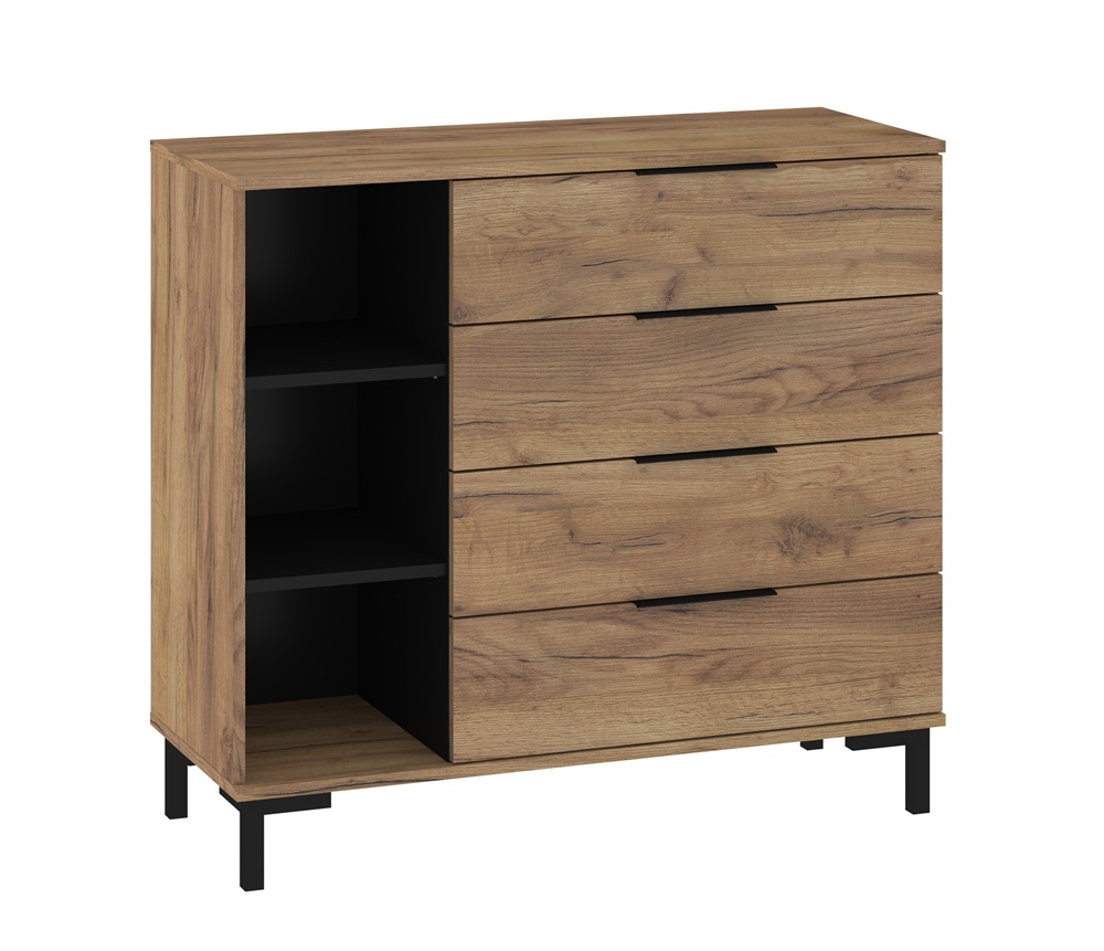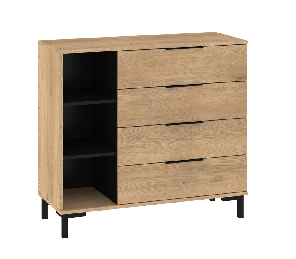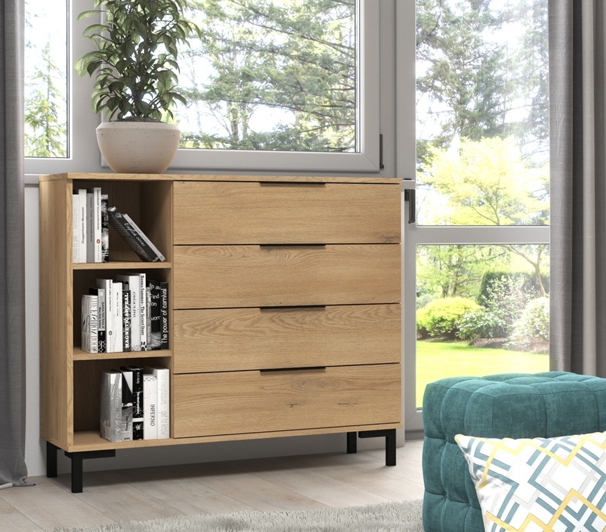 Kummutil on 4 sahtlit ja avatud riiuliosa.