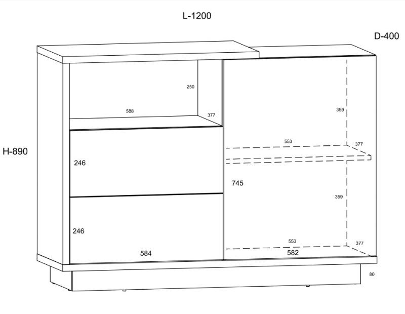 Kummutil on 1 uks ja 2 sahtlit.