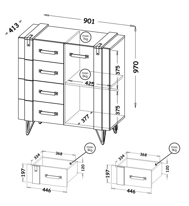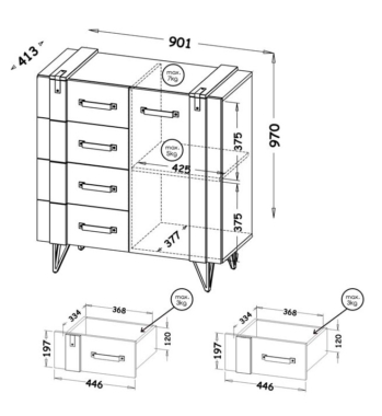 Kummutil on 1 uks ja 4 sahtlit.