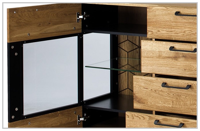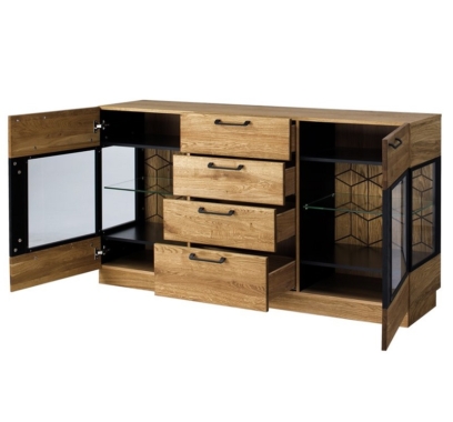 Kummutil on 4 sahtlit ja 2 ust. Uksed ja küljed on osaliselt klaasist.