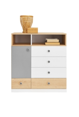 Kummutil on 1 uks, 5 sahtlit ja avatud riiul.
