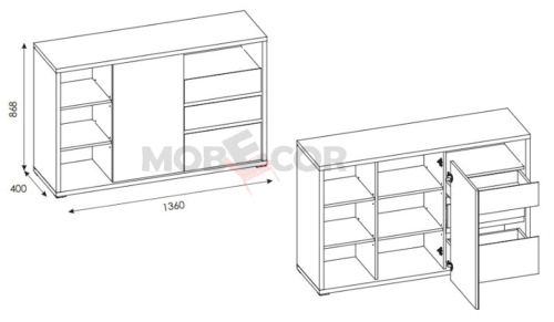 Kummutil on 1 uks ja 3 sahtlit.