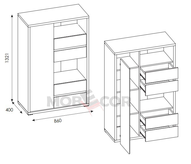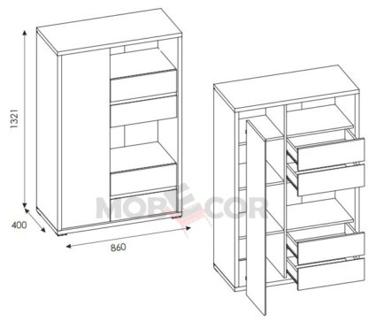 Kummutil on 1 uks ja 4 sahtlit.