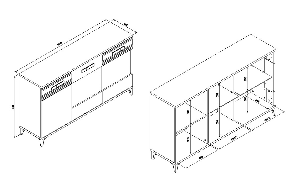 Siseriiulid: lamineeritud puitlaastplaat, 16 mm. Klaasiga uste taga on klaasist riiulid.