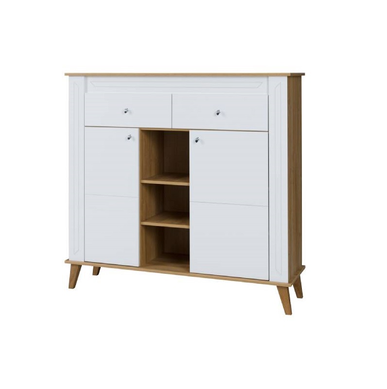 Kummutil on 2 ust, 2 sahtlit ja avatud riiul.