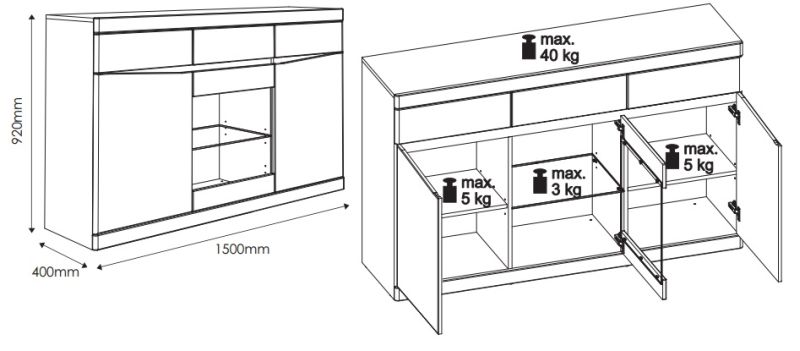Materjal: kvaliteetne ja vastupidav melamiinkattega laminaat + MDF.