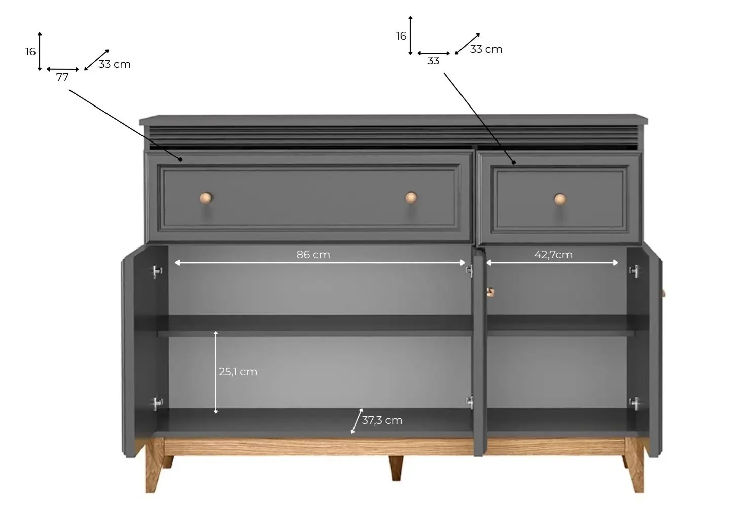 Kummutil on 2 sahtlit + 2 kapiosa – paindlik hoiustamine.