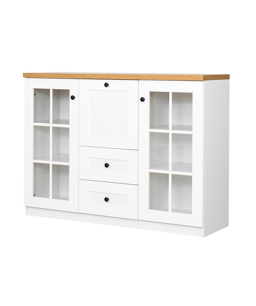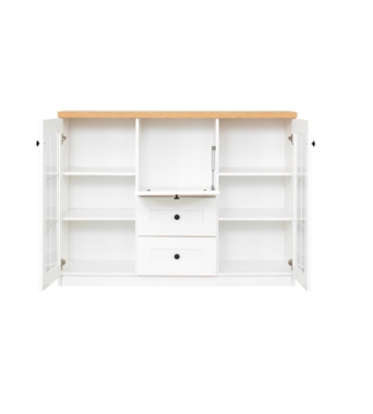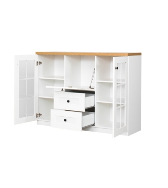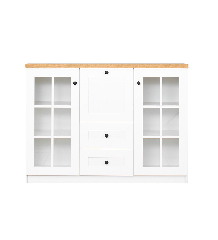 Kummutil on 2 sahtlit, 2 klaasiga ust ja 1 klapiga uks, mis avaneb ette.