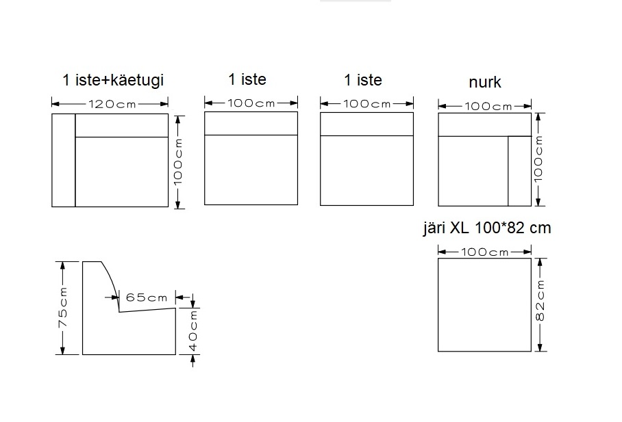 Komplekti kuulub: 1-ne moodul käetoega; 2 x 1-ne moodul; nurgamoodul ja järi 82 x 100 cm.