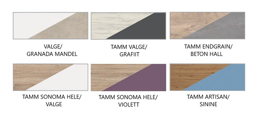 Värvivalik: valge/granada mandel; tamm valge/grafiit; tamm endgrain/beton hall; tamm sonoma hele; violett; tamm artisan/sinine.