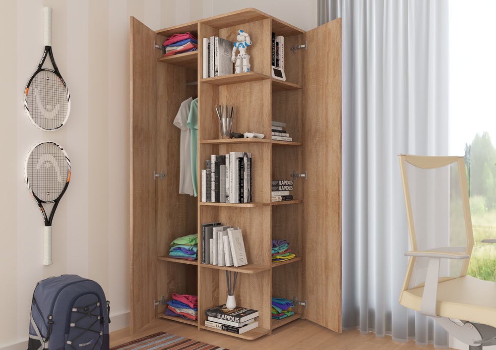Eest avaneva ukse taga on riidepuutoru ja 2 riiulit. Kõrvalt avaneva ukse taga on riiulid.