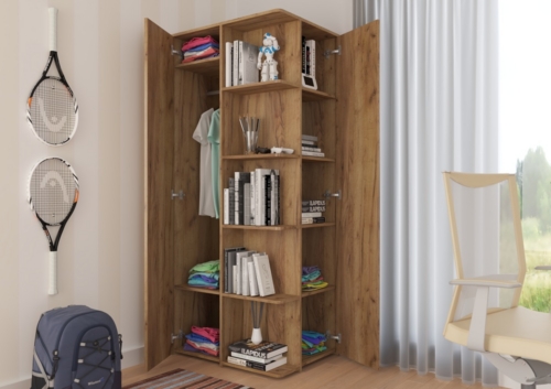Eest avaneva ukse taga on riidepuutoru ja 2 riiulit. Kõrvalt avaneva ukse taga on riiulid.