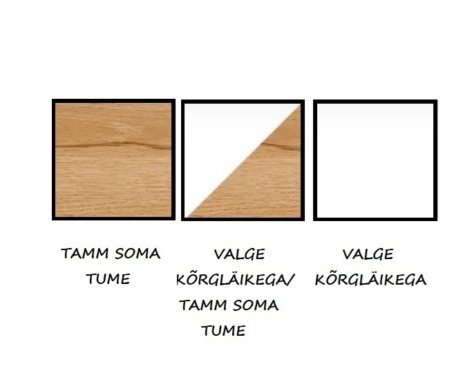 Värvivalik: tamm Soma pärl (DSP); tamm Soma tume (DSC); valge kõrgläikega (BI); valge kõrgläikega/tamm Soma tume (BI/DSC).