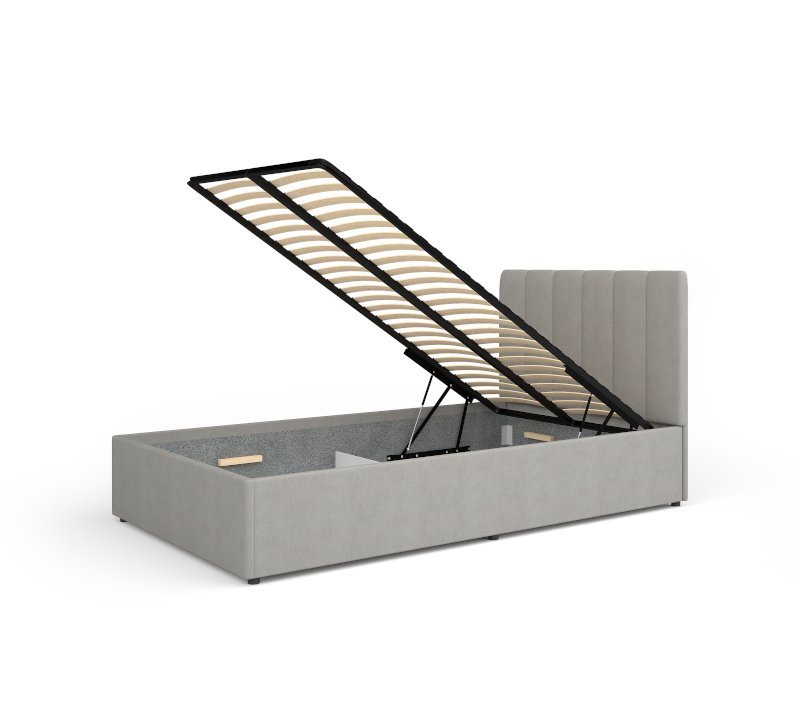 Voodil on gaasamortidega ülestõstetav voodipõhi, mille all on mahukas pesukast.