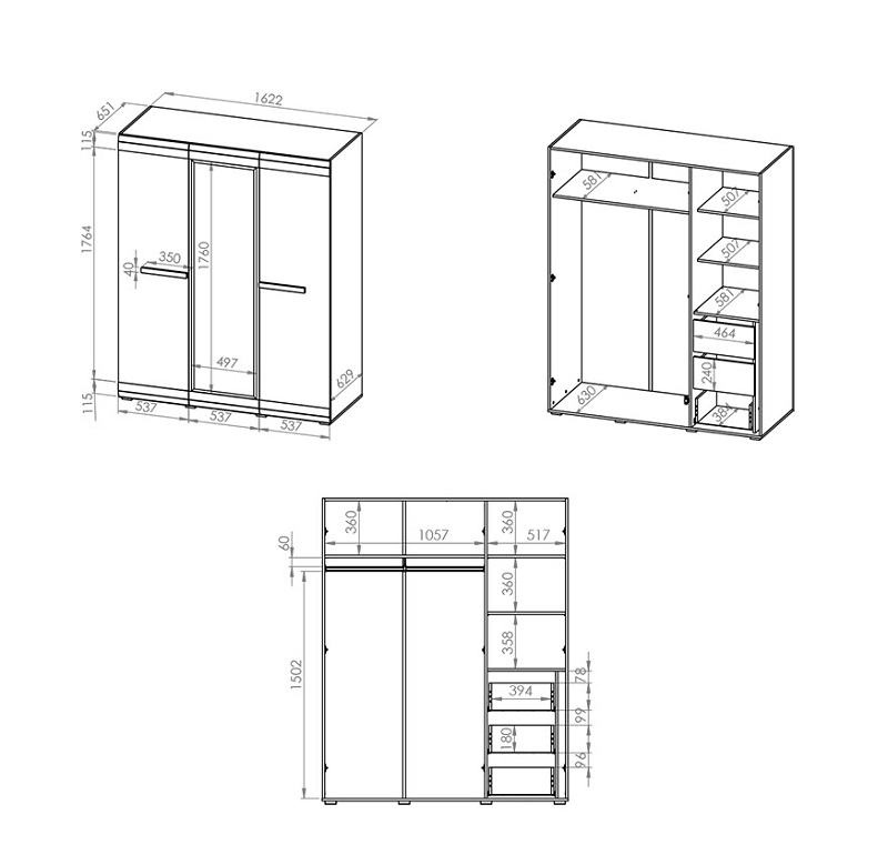 Uste taga on riidepuutoru, mütsiriiul, 3 pesuriiulit ja 3 sahtlit.