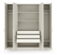 Riidekapil on 4 ust. Uste taga on riiulid, riidepuutorud ja 3 sahtlit.