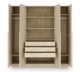 Riidekapil on 4 ust. Uste taga on riiulid, riidepuutorud ja 3 sahtlit.